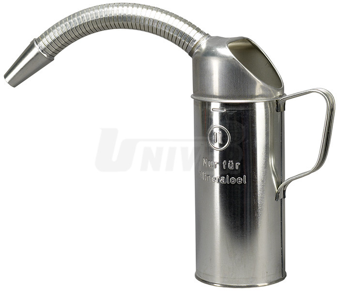 Odměrné nádoby z bílého plechu (pocínované) o objemu 1 l a 2 l mají kovové pružné výtokové nástavce dl. 230 mm, ergonomické držadlo a konzervovanou vrchní plochu.Použití: především na oleje, průmysl, stavebnictví, zemědělství, řemeslná výroba, dílny apod.