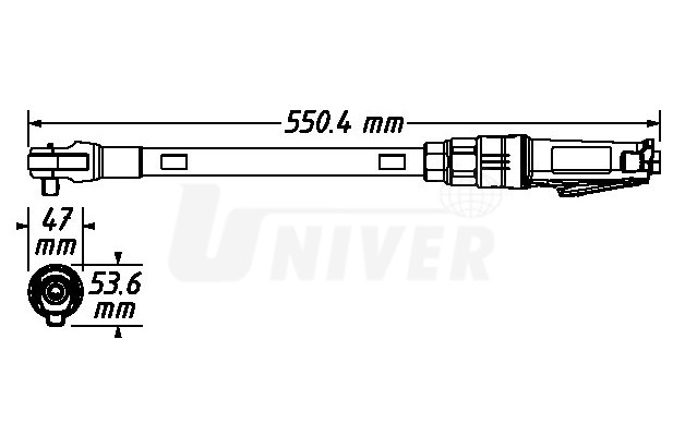 Extra dlouhá (551 mm) pneumatická ráčna (1/2") s max. utahovacím momentem 94,8 Nm se vyznačuje použitím i ve stísněném prostoru, přičemž dovoluje ruční utahování až do 400 Nm.- pneumatická ráčna extra dlouhá