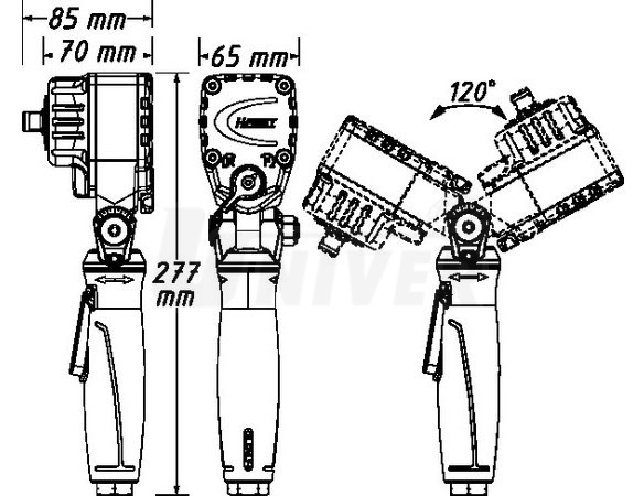Pneumatický rázový utahovák 1/2" řady Twin Turbo s otočnou hlavou (120°), s otočnou, nastavitelnou rukojetí (360°).- pneumatický rázový utahovák 1/2" řady Twin Turbo s maximálním utahovacím momentem 500 Nm
