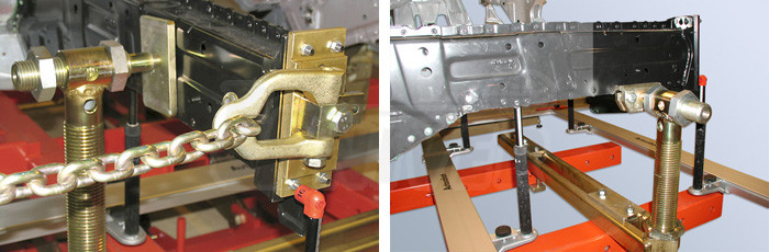 Když se provádí rovnání směrem nahoru nebo dolů, nastavitelný nosník 680E lze použít jako podpěru i pro aktuální rovnání. Jak je vidět z připojených obrázků, šroub A nosníku umožňuje tlak/tah přibližně 4 t, který je většinou dostatečný pro srovnání přední nebo zadní části karosérie.
