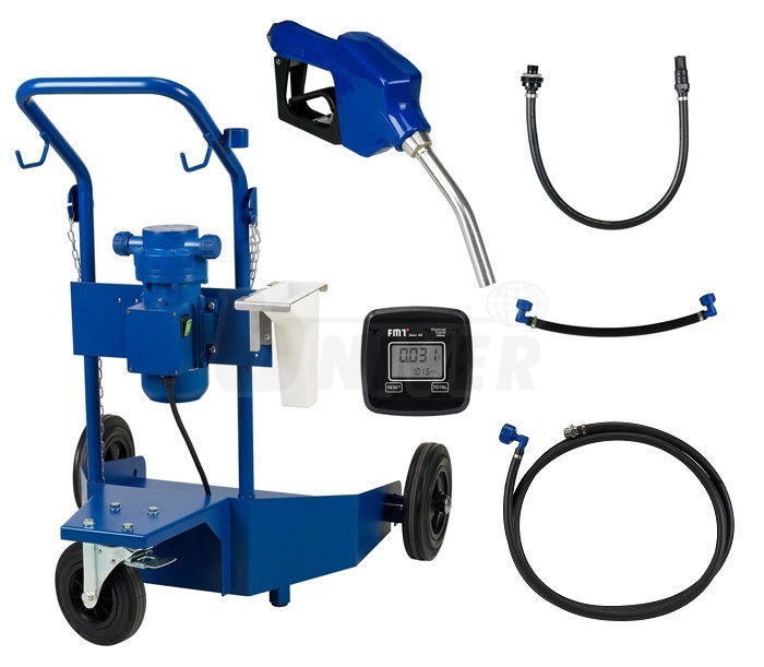 Pojízdná plnička AdBlue a vody s elektrickým membránovým čerpadlem 230 V 10 l / min, automatickou výdejní pistolí, digitálním průtokoměrem a s vozíkem pro sudy 200 / 220 l.- pojízdná plnička AdBlue a vody se samonasávacím membránovým čerpadlem 230 V, automatickou výdejní pistolí, digitálním průtokoměrem, příslušenstvím, s tříkolovým vozíkem pro sudy 200 / 220 l