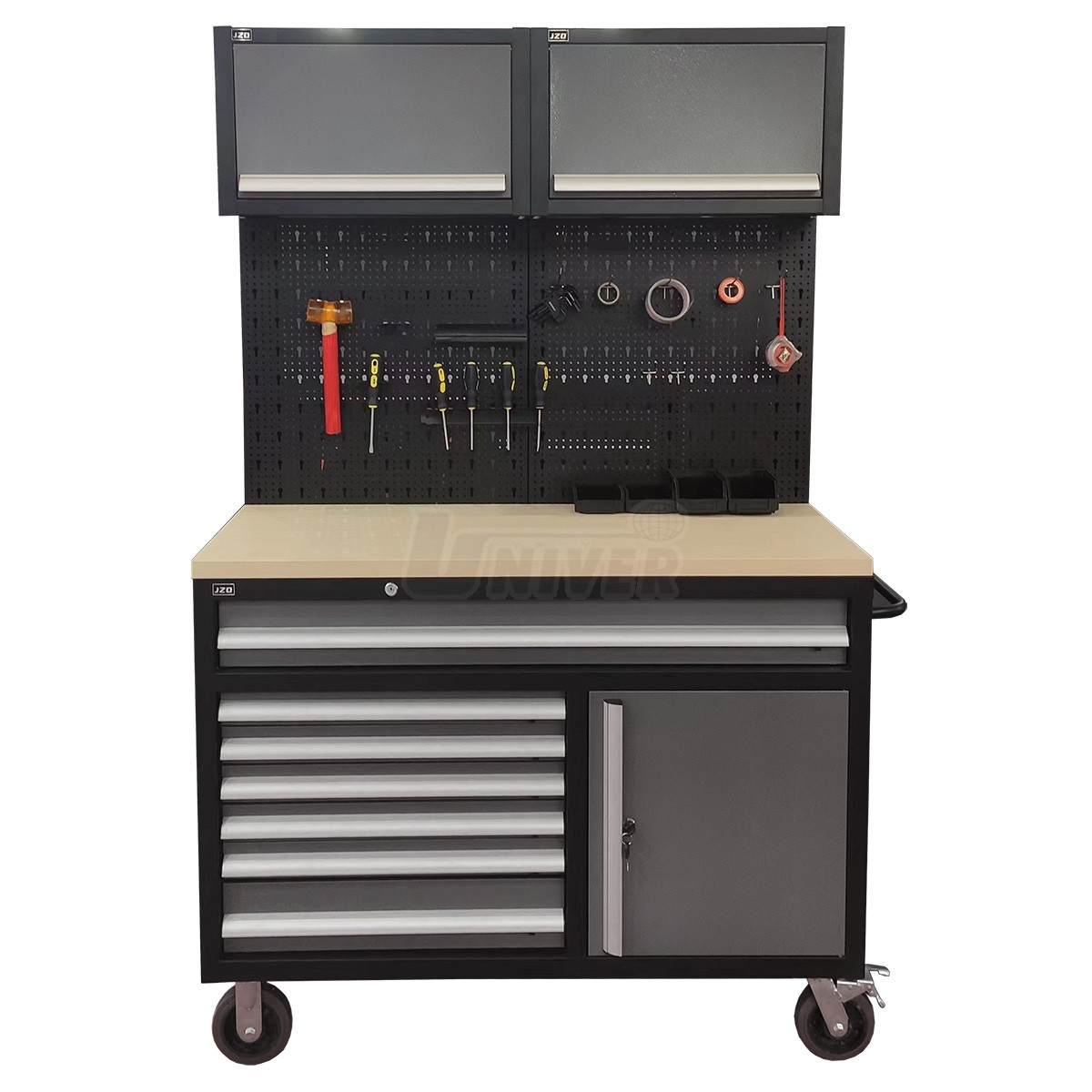 Modulární pojízdná sestava celokovového nábytku se spodní skříňkou, stěnovými děrovanými deskami, pracovní deskou a 2 výklopnými horními skříňkami o celkových rozměrech 1200x500x1900 mm.- praktická pojízdná sestava celokovového nábytku na modulární bázi