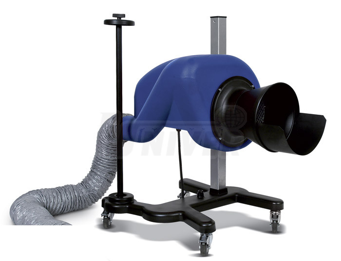 - podvozek nového typu se 4 kolečky a se sloupkem, na kterém se pohybuje a výškově nastavuje skříň ventilátoru s trychtýřem a hadicí odvodu výfukových plynů
