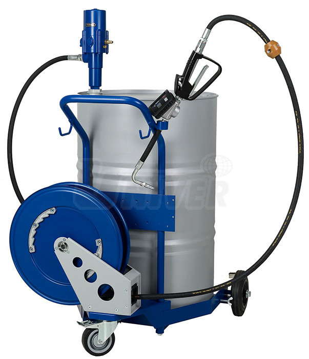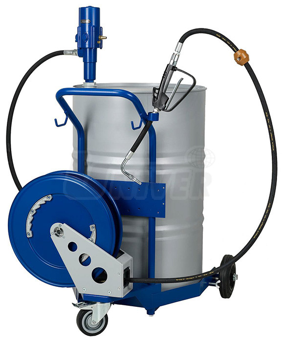 Pojízdné plničky olejů (do SAE 90) s vrchním pneumatickým čerpadlem 3:1, se sací trubkou, navijákem hadice s výdejní pistolí a s vozíkem pro sudy 200/220 l.- uplatní se zejména v autoservisech, při servisu stavebních a zemědělských strojů, servisu armádní techniky, v průmyslu, údržbě atd.