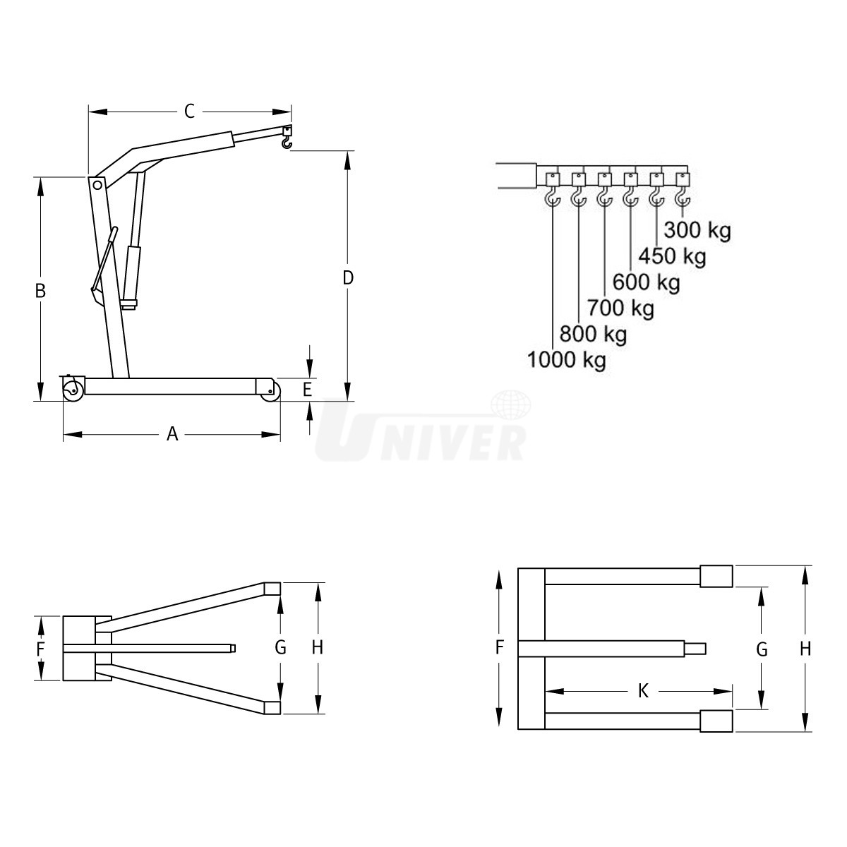 Pojízdný skládací hydraulický dílenský jeřáb ("žirafa") s maximální nosností 1 t se používá zejména pro zvedání a ukládání agregátů při jejich montáži a demontáži.- nosné rameno má několik poloh vysunutí a podle toho se také řídí nosnost jeřábu