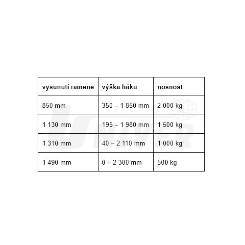 - nosné rameno má 4 polohy vysunutí a podle toho se také řídí nosnost jeřábu