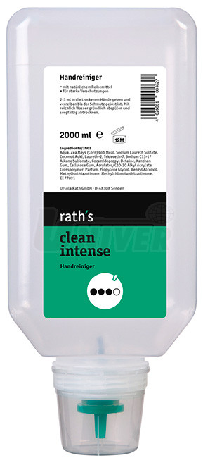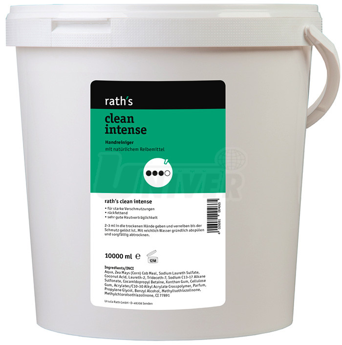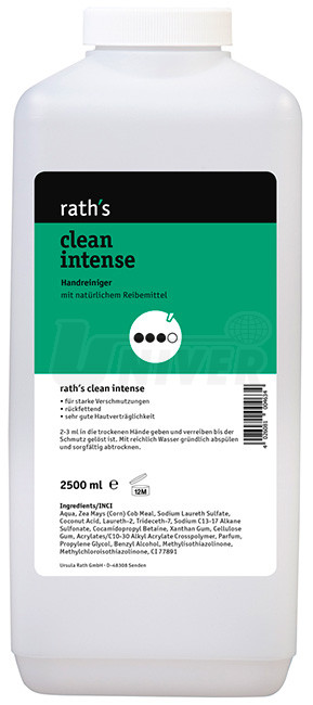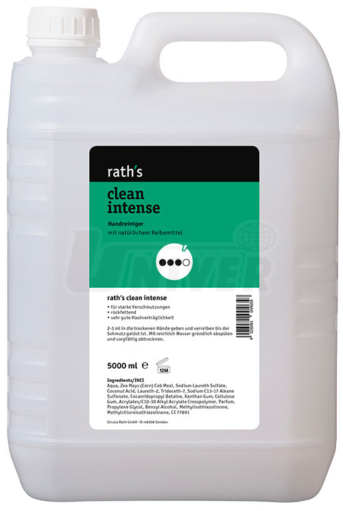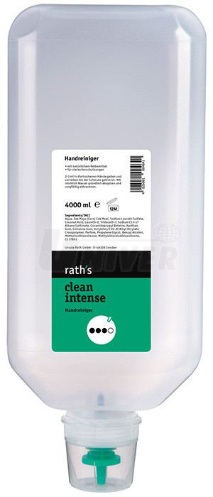 Po ukončení práce se na suchou nebo zvlhčenou pokožku dá cca 2-3 ml (množství velikosti lískového ořechu) přípravku a ten se s pozvolným přidáváním vody v rukách roztírá a uvolňuje špínu. Potom se ruce opláchnou bohatě vodou a pečlivě vysuší. Při silně ulpívajících nečistotách se tento postup zopakuje. Skladovací podmínky: teplota 0°C až 25°C. Trvanlivost (neotevřené): 30 měsíců. rath´s clean intense je biologicky odbouratelný.