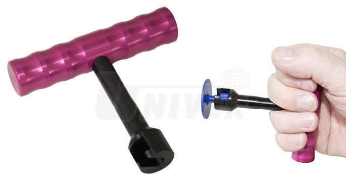 Přípravek tvaru "T" k vytahování nalepených plastových vytahovacích adaptérů pro odstraňování promáčklin karosérií.- opravy důlků a promáčklin na karosériích vozidel technologií PDR (Paintless Dent Repair) se provádějí pomocí speciálního nářadí a pomůcek za studena bez nutnosti provádět konvenční tmelení, broušení a lakování poškozeného místa, přičemž oprava vyžaduje méně času a je levnější
