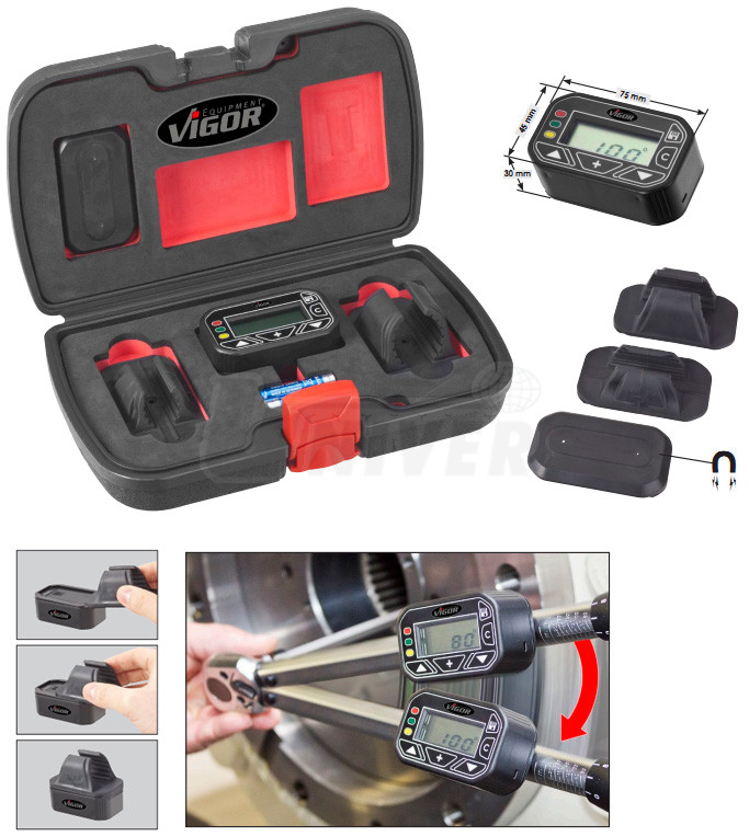 Digitální přístroj pro měření utahovacího úhlu umožňuje velmi jednoduché a přesné měření utahovacího úhlu.Sada obsahuje digitální měřič, adaptér s nástavci a silným magnetem, který se dá snadno nasadit na jakoukoli ráčnu, klíč, stavitelný klíč apod. a plastový kufřík. Malé rozměry přístroje dovolují jeho použití i v obtížně přístupných prostorech.
