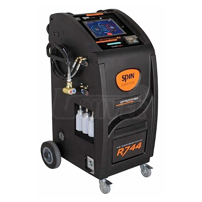 Plně automatický přístroj pro servis klimatizací s chladivem R744 (CO2) s integrovanou tiskárnou a databanku vozidel.- přístroj je konstruován s ohledem na velmi vysoké tlaky v těchto klimatizačních systémech (běžný provozní tlak se pohybuje v rozmezí 70 až 140 bar, při vysokých venkovních teplotách může tlak ve vysokotlakém okruhu dosahovat až 150–170 bar, v nízkotlakém cca 30–40 bar, při vypnuté klimatizaci se tlak srovná v celém systému a závisí na okolní teplotě, často bývá kolem 30–50 bar), systém pracuje nad kritickým bodem CO2 (31°C, 72,8 bar), což znamená, že v kondenzátoru (plynovém chladiči) nedochází ke kondenzaci, ale chladivo zůstává v plynné fázi pod vysokým tlakem, kvůli extrémním tlakům musí být všechny součásti (hadice, kompresor, kondenzátor) speciálně konstruovány a dimenzovány, aby vydržely tlaky přesahující 130 bar