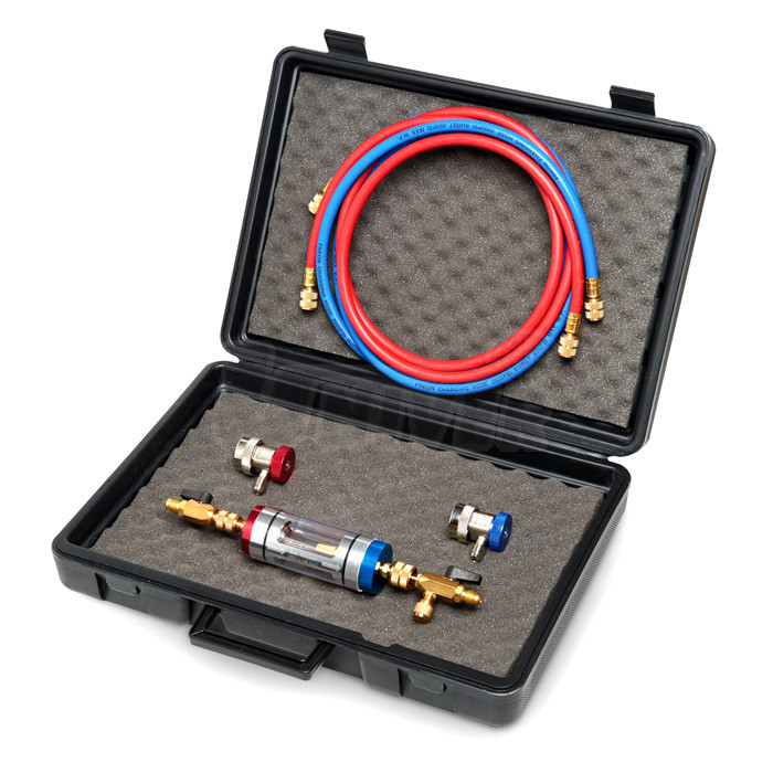 Přístroj pro snadné a rychlé přezkoušení stavu oleje a chladiva R 134a v klimatizaci podle jeho zbarvení.- pomocí přístroje lze snadno provést odběr oleje z klimatizačního systému a provést jeho zkoušku z hlediska znečištění, stav oleje v chladicím prostředku klimatizace je totiž rozhodující pro správnou funkci klimatizace