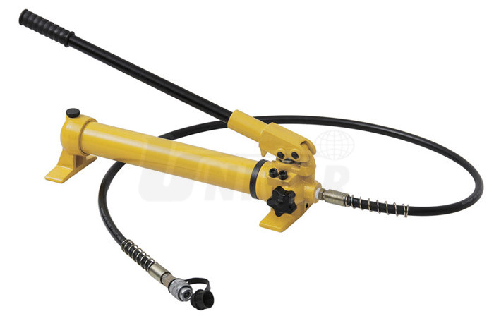 Ruční dvourychlostní hydraulická pumpa s ovládací pákou a s vysokotlakou hadicí s rychlospojkou.- pro pohon jednočinných hydraulických válců, různých hydraulických zařízení, rozpínáků, stahováků, hydraulických lisů, nůžek atd.