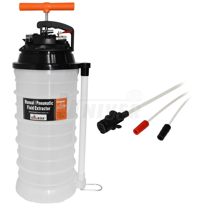 Přístroj pro ruční nebo pneumatické odsávání všech druhů olejů, vody a dalších neagresivních kapalin s nádobou 10,5 l, včetně 3 odsávacích trubiček Ø 9,8/6,7/5,8 mm.- snadné ruční (není-li k dispozici přívod stlačeného vzduchu nebo stačí jen vytvoření podtlaku pumpováním) nebo komfortnější pneumatické odsávání všech druhů olejů (motorových, převodových atd.) z motorů a převodovek automobilů, motocyklů, lodních motorů, stacionárních motorů, zahradních traktorů, sekaček trávy apod.) a rovněž brzdové kapaliny, nemrznoucích kapalin atd.