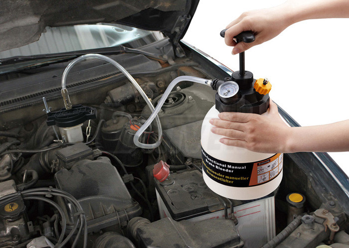 Sada pro odvzdušňování brzdových a spojkových systémů s ruční pumpou, tlakoměrem, nádržkou 3 l, Euro-adaptérem, univerzálním adaptérem s řetězem, hadicí a záchytnou nádobou.- Euro adaptér / uzávěr se našroubuje na hlavní brzdový válec a pak spojí hadičkou s přístrojem naplněným novou brzdovou kapalinou, pak se pumpováním zásobní nádržka natlakuje a čerstvá brzdová kapalina vytlačuje starou ze systému přes odvzdušňovací šroubky postupně na všech 4 na kolových brzdových jednotkách, na odvzdušňovací šroubek se vždy připojí hadička s nádobkou pro vytlačovanou brzdovou kapalinu