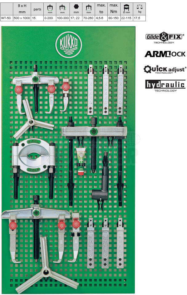 Univerzální sada 2- a 3-ramenných stahováků se standardními stahovacími háky a separátorem (oddělovacím přípravkem) na děrované tabuli 500x1000 mm německé firmy KUKKO-Werkzeugfabrik patří do nejvyšší kvalitativní třídy v Evropě.Ze 16-dílné sady lze sestavit tyto stahováky: