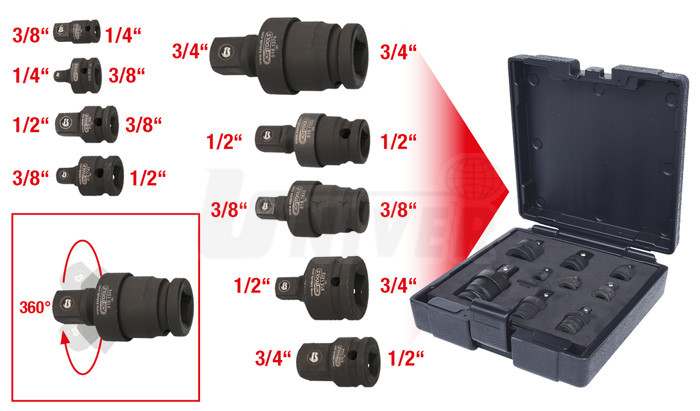9-dílná sada speciálních kovaných adaptérů / redukcí různých rozměrů (čtyřhrany 1/4", 3/8" a 1/2").- 9-dílná sada různých kovaných adaptérů / redukcí se čtyřhrany 1/4", 3/8" a 1/2"