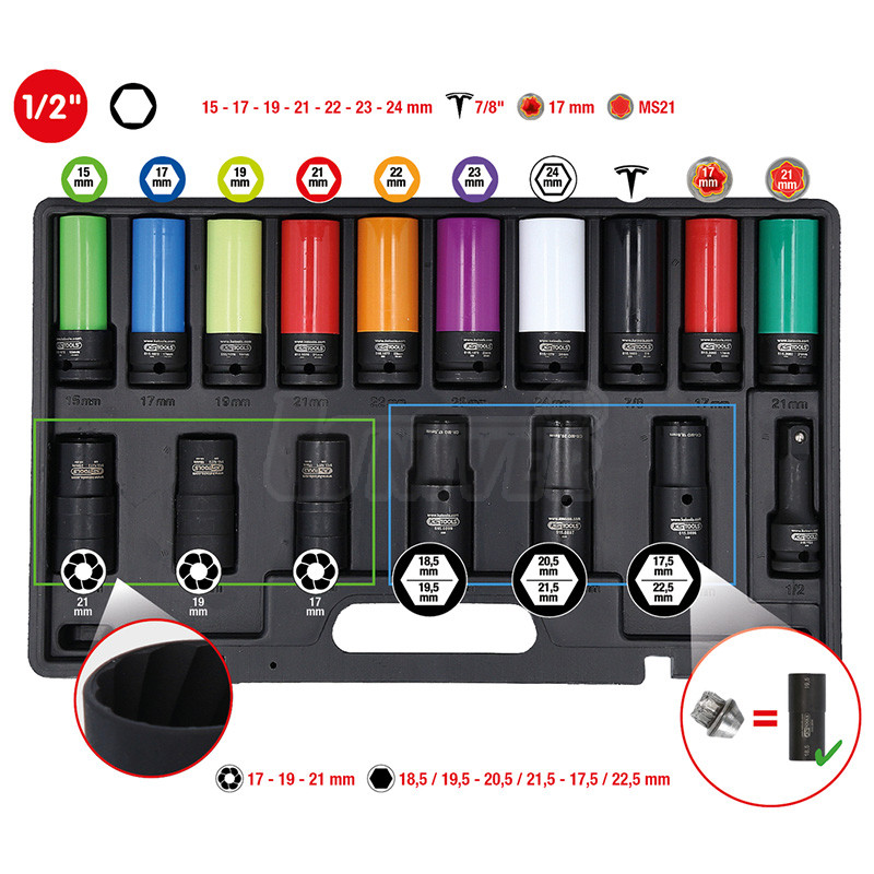 17-dílná sada obsahuje šestihranné 1/2" nástrčné kované hlavice a spirálové nástrčné hlavice k vyšroubování poškozených šroubů.- čtyřhran 1/2"