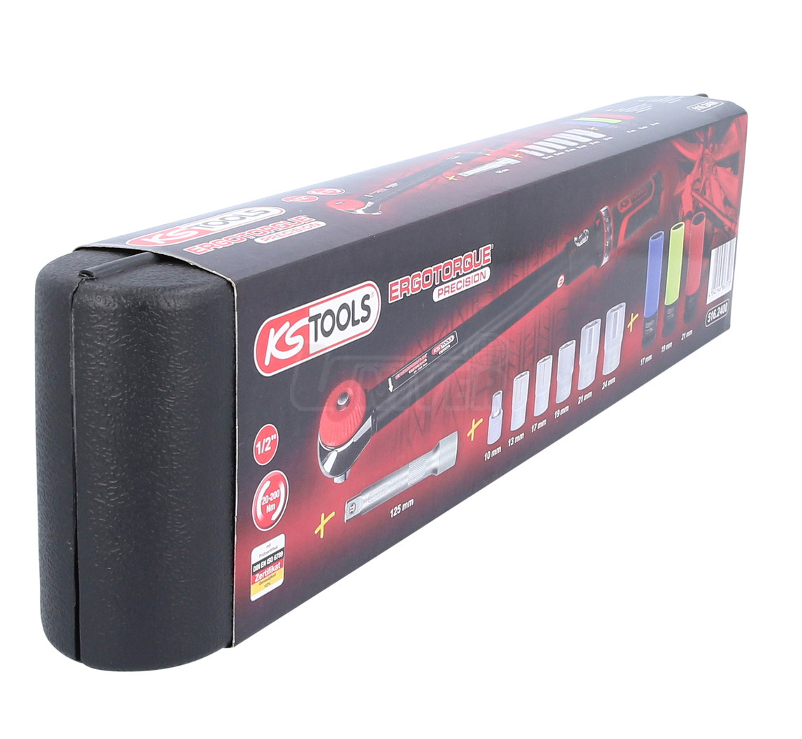 11-dílná sada obsahuje momentový klíč ERGOTORQUE precision 20 – 200 Nm, 6 nástrčných hlavic 1/2" 10 – 24 mm, prodlužovací kus 1/2" 125 mm a 3 kované hlavice.- momentový klíč ERGOTORQUEprecision 20 – 200 Nm dl. 500 mm