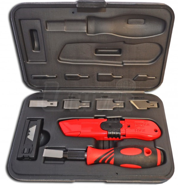 Sada na úpravu profilu pro osazení skla slouží především pro odstranění zbytků těsnicích hmot, lepidel, ale i nálepek apod..- sada v praktickém plastovém kufříku umožňuje snadnou a rychlou úpravu profilu, do kterého má být následně osazeno sklo