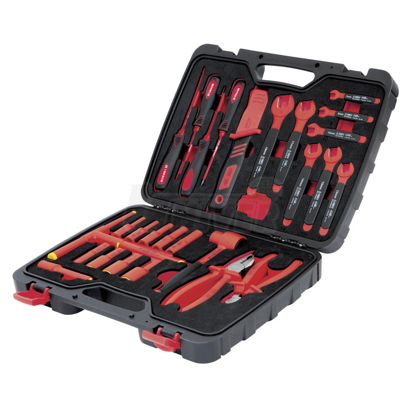 25-dílná sada izolovaného ručního nářadí pro údržbu a opravy zejména hybridních nebo plně elektrických vozidel podle normy VDE (individuálně testovány pro použití do 1000 V AC).- nářadí umožňuje bezpečnou práci až do napětí 1000 V podle normy DIN EN 60900 AC / 1000 V