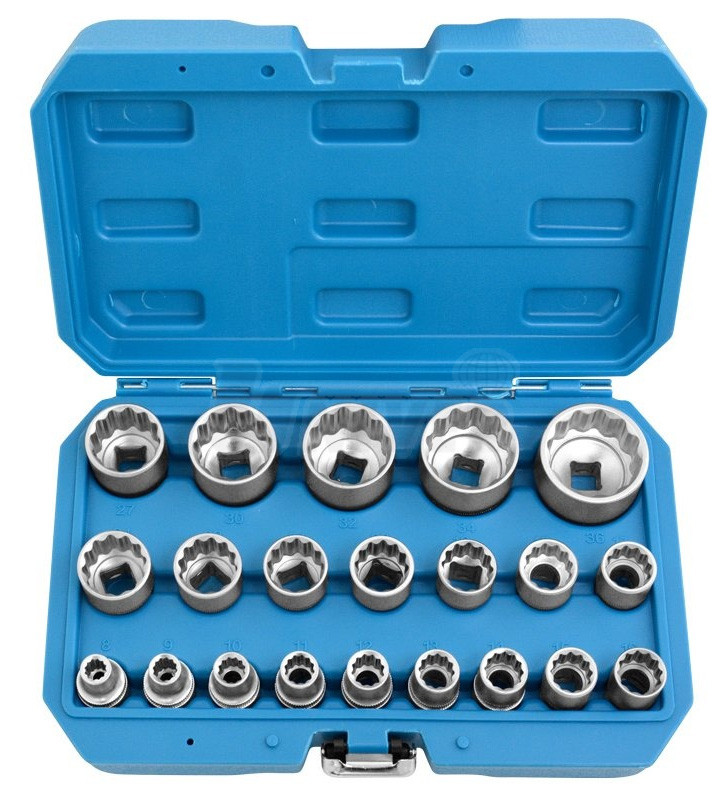 Sada 21 nástrčných hlavic 1/2" (8 až 36 mm) s profilem Gear Lock, který je univerzální a umožňuje použití na 6-hranné i 12-hranné šrouby / matice, metrické i palcové a také XZN a E-profilu.- sada nástrčných hlavic 12,5 mm (1/2)" 8 až 36 mm s profilem Gear Lock