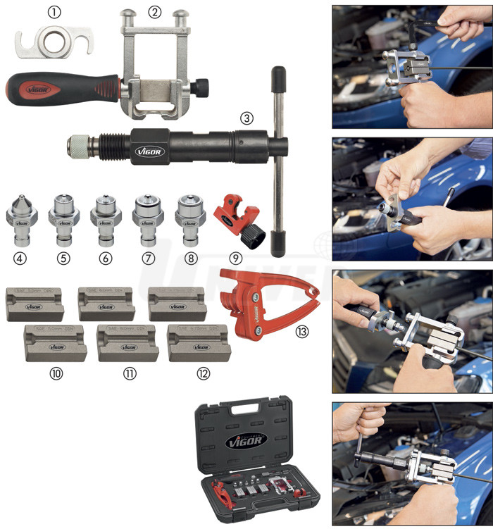 13-dílná sada nástrojů pro úpravu konců/osazení brzdových a hydraulických trubiček v plastovém kufříku.- snadné a hlavně kvalitní vylisování kuželové plochy na konci brzdové/spojkové nebo hydraulické trubičky (ocelové, měděné, hliníkové atd.) podle standardů DIN/SAE bez poškození případné její povrchové ochrany
