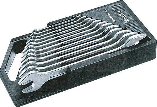 12-dílná sada oboustranných otevřených klíčů obsahuje tyto klíče:450 N - 6 x 7, 8 x 9, 10 x 11, 12 x 13, 14 x 15, 16 x 17, 18 x 19, 20 x 22, 21 x 23, 24 x 27, 25 x 28, 30 x 32.