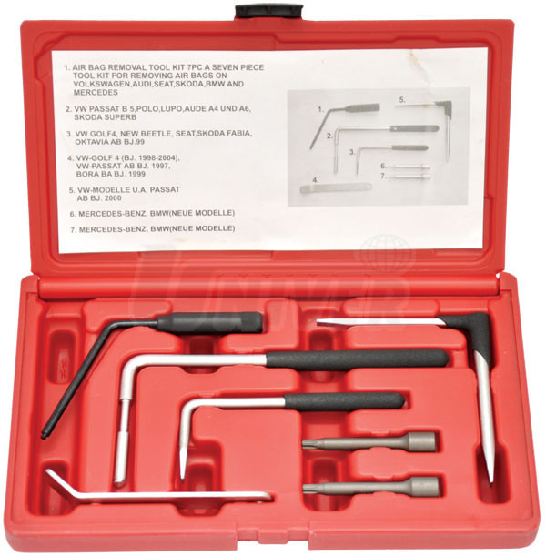 Sada 7 přípravků pro demontáž airbagů se uplatí u řady vozů, např. Škoda Fabia/Octavia/Superb, VW Lupo/Polo/Golf/ Passat/Bora/Jetta/Beatle, Audi A4/A6, BMW, Mercedes-Benz.Objednávka zboží