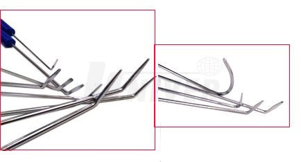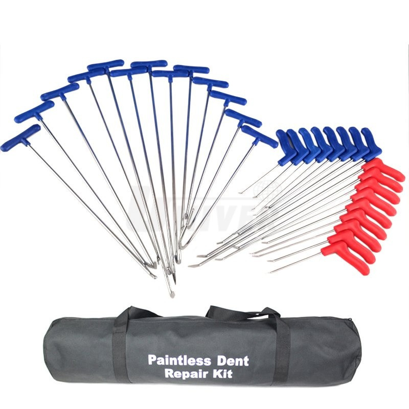 Sada přípravků na opravy důlků a promáčklin karosérií jejich vytlačením technologií PDR obsahuje 30 různě tvarovaných a různě dlouhých vyrovnávacích háků.- opravy důlků a promáčklin na karosériích vozidel technologií PDR (Paintless Dent Repair) se provádějí pomocí speciálního nářadí / přípravků a pomůcek za studena bez nutnosti provádět konvenční tmelení, broušení a lakování poškozeného místa