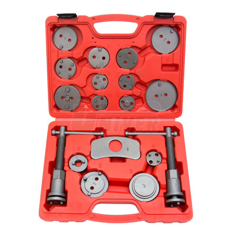 Univerzální sada v plastovém kufříku slouží pro montáž a zpětné vracení pístků třmenu kotoučových brzd.Obsahuje 2 šroubové přípravky (pro pravý i levý závit), 1 doraz a 15 adaptérů