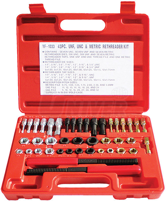 Sada přípravků pro opravy metrických i palcových závitů v plastovém kufříku obsahuje tyto komponenty: přípravky pro opravy závitů šroubů - UNF 6x1,0, 8x1,25, 10x1,25, 10x1,50, 12x1,25, 12x1,5, 12x1,75 mm a 14 palcových rozměrů, přípravky pro opravy závitů matic apod. - UNF 6x1,0, 8x1,25, 10x1,25, 10x1,50, 12x1,25, 12x1,5, 12x1,75 mm a 12 palcových rozměrů, 1 speciální pilník pro opravy metrických závitů a 2 obdobné pilníky pro palcové rozměry.