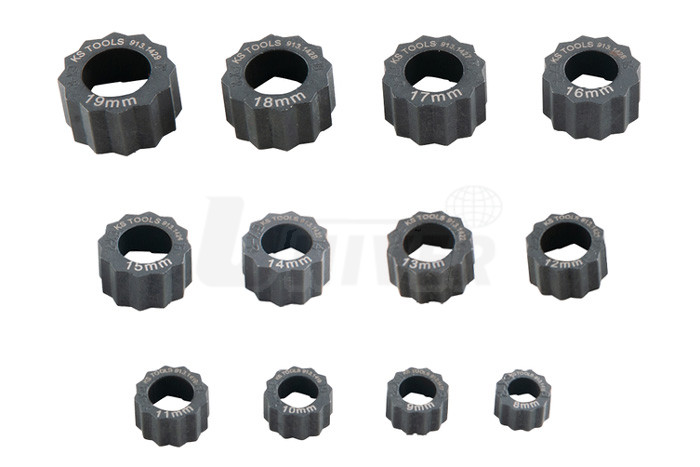 12-dílná sada přípravků pro uvolňování a vyšroubování pevně usazených matic s poškozenými / "strženými" hlavami (8 / 9 / 10 / 11 / 12 / 13 / 14/ 15 / 16 / 17 / 18 / 19).- 12-dílná sada speciálních přípravků pro uvolňování matic se strženými hlavami