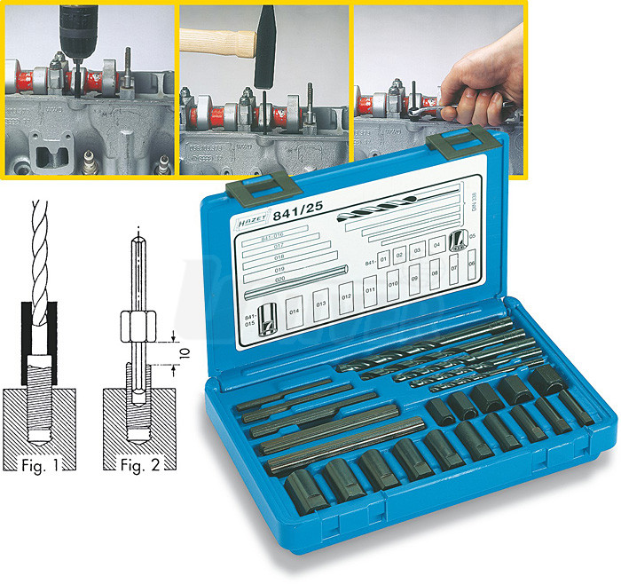 Sada přípravků v plastovém kufříku umožňuje vyšroubování zalomených šroubů a závitových čepů o průměru 6 mm až 15 mm. Přípravky jsou vyrobené ze speciální oceli. Postup je následující:1. Zalomený šroub/čep se navrtá vrtákem a vrtací objímkou.