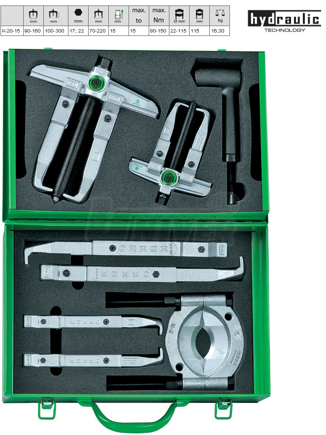 Sada stahováků s přídavnou hydraulickou jednotkou německé firmy KUKKO-Werkzeugfabrik patří do nejvyšší kvalitativní třídy v Evropě.8-dílnou sadu v kovovém kufříku tvoří: