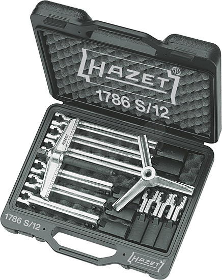 Sada univerzálních stahováků s rychloupínáním (12-dílná) v plastovém kufříku se skládá ze zápustkově kovaného trojramenného příčníku (1786-3), obdobného dvojramenného příčníku (1786-21), extra tvrdého vřetena M14x1,5x140 mm (1786-01) a šesti posuvných ramen/čelistí ze speciální vysokouhlíkové oceli délky 100 mm, 200 mm a 250 mm, včetně krátkých i dlouhých fixačních pák. Ramena lze na příčníku otočit, takže čelisti mohou stahovat jak zvnitřku, tak vně. Nastavení je neobyčejně rychlé díky nově vyvinutým rychloupínačům. Navíc příčníky jsou opatřeny stupnicemi pro stejné nastavení ramen. Ze sady tak lze snadno vytvořit dvouramenný i tříramenný univerzální stahovák s vnějším i vnitřním nasazením. Rozevření 120 mm, hloubka 100/200/250 mm.Tyto stahováky zajišťují rovnoměrné rozložení stahovací síly a používají se zejména pro stahování kuličkových ložisek, kotoučů, ozubených kol apod. Vyznačují se naprostou spolehlivostí a vysokou životností i v nejtěžších provozních podmínkách.