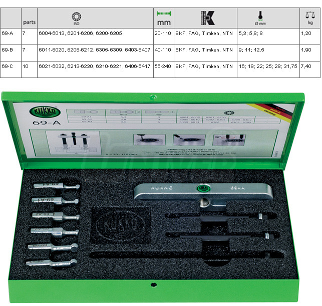 Sady stahováků kuličkových ložisek (7-dílná/69-A a 69-B a 10-dílná/69-C) německé firmy KUKKO-Werkzeugfabrik patří do nejvyšší kvalitativní třídy v Evropě.Vlastnosti: