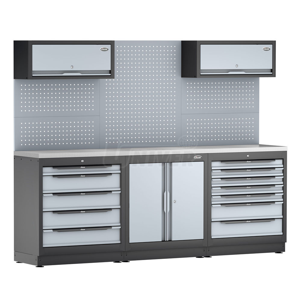 Sestava kovového dílenského nábytku (2588 x 526 x 1980 mm) s nerezovou pracovní deskou.- univerzální použití pro uložení nářadí, nástrojů, materiálu, vybraných součástek, dokumentace atd.