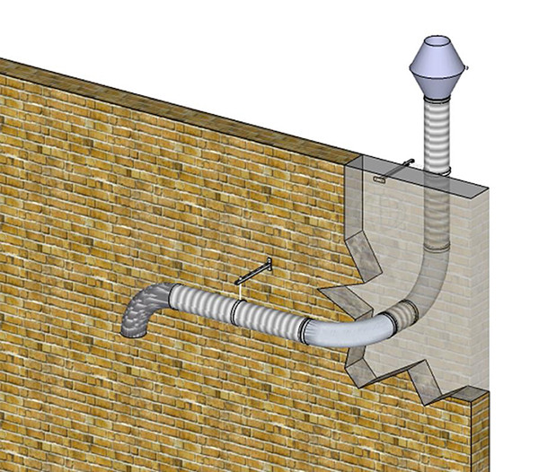 Odvod výfukových plynů motorových vozidel dl. 3 m s průchodem stěnou a vertikálním vyústěním ve venkovním prostředí.Sestava se skládá z následujících komponentů: ZGS TU (1 ks), ZGS NIP (1 ks), ZGS CR90 (2 ks), ZGS CAP (1 ks), ZGS AP (1 ks), ZGS SME300 (2 ks), GTA (1 ks) a GF (2 ks).