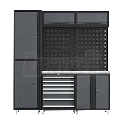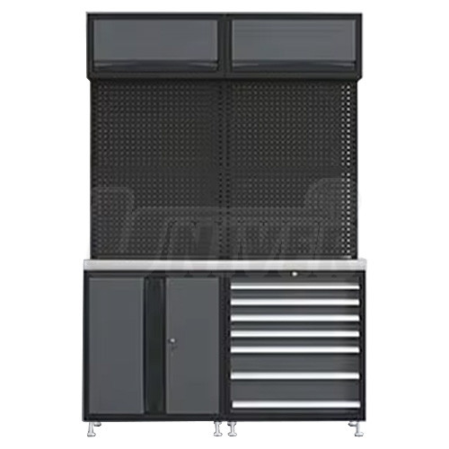 Modulární sestavy celokovového autoservisního nábytku se 2 spodními skříňkami (dvoudvířková a zásuvková) se stěnovými děrovanými deskami, s pracovní deskou a se 2 výklopnými horními skříňkami.- praktické sestavy celokovového nábytku na modulární bázi s univerzálním využitím