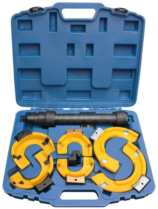 7-dílná sada kvalitních přípravků pro stahování vinutých pružin zavěšení kol McPherson Ø 80 – 195 mm.- univerzální sada použitelná pro většinu osobních a užitkových automobilů