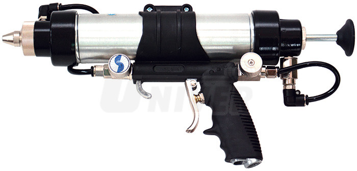 Profesionální pneumatická stříkací a vytlačovací pistole pro nanášení hmot stříkacích, těsnicích, tmelicích a lepicích v různých kartuších a fóliových/salámových) sáčcích (silikonové, akrylové, polyuretanové a další hmoty). Takto lze kromě jiného utěsňovat sváry, různé mezery, vytvářet tzv. "housenky" shodné s prvovýrobou, nanášet lepidlo při montáži/lepení skel, nanášet rúzné hmoty v oblasti sanitární techniky, zhotovovat nástřiky s odlišnou strukturou/texturou (hrubší korálková, střední zvrásněná, jemnější nástřiková apod.), která obnovuje originální povrchovou úpravu například karosérií automobilů. S touto pistolí lze stříkat i spodní části vozidel. Je vybavena systémem pro zabránění výtoku/odkapávání materiálu po ukončení pracovního procesu. Není vhodná pro vysoce viskozitní lepidla.Pneumatická pistole má aluminiový zásobník ve tvaru válečku/trubice s předním i zadním víčkem. K pohodlnému držení a snadnější práci i v obtížněji přístupných místech slouží ergonomická rukojeť s měkkým krytem a spouští. Blok rukojeti, spouště a obou regulačních ventilů je na aluminiovém zásobníku posuvný, takže celou pistoli lze podle potřeby obsluhy perfektně vyvážit. Pneumatickou část tvoří vzduchový mechanismus, 3 trysky, vzduchové hadičky a přední a zadní otočný regulační ventil. Přední zajišťuje regulaci přídavného vzduchu přiváděného k výstupní trysce. Zadní ventil s integrovaným přetlakovým ventilem umožňuje jemnou regulaci vydávaného množství stříkané nebo vytlačované hmoty. K dispozici je rovněž posuvná pístnice v zadní části zásobníku. Stlačený vzduch z kompresoru nebo z dílenského rozvodu vzduchu se do pistole přivádí přes rychlospojku ve spodní části rukojeti.