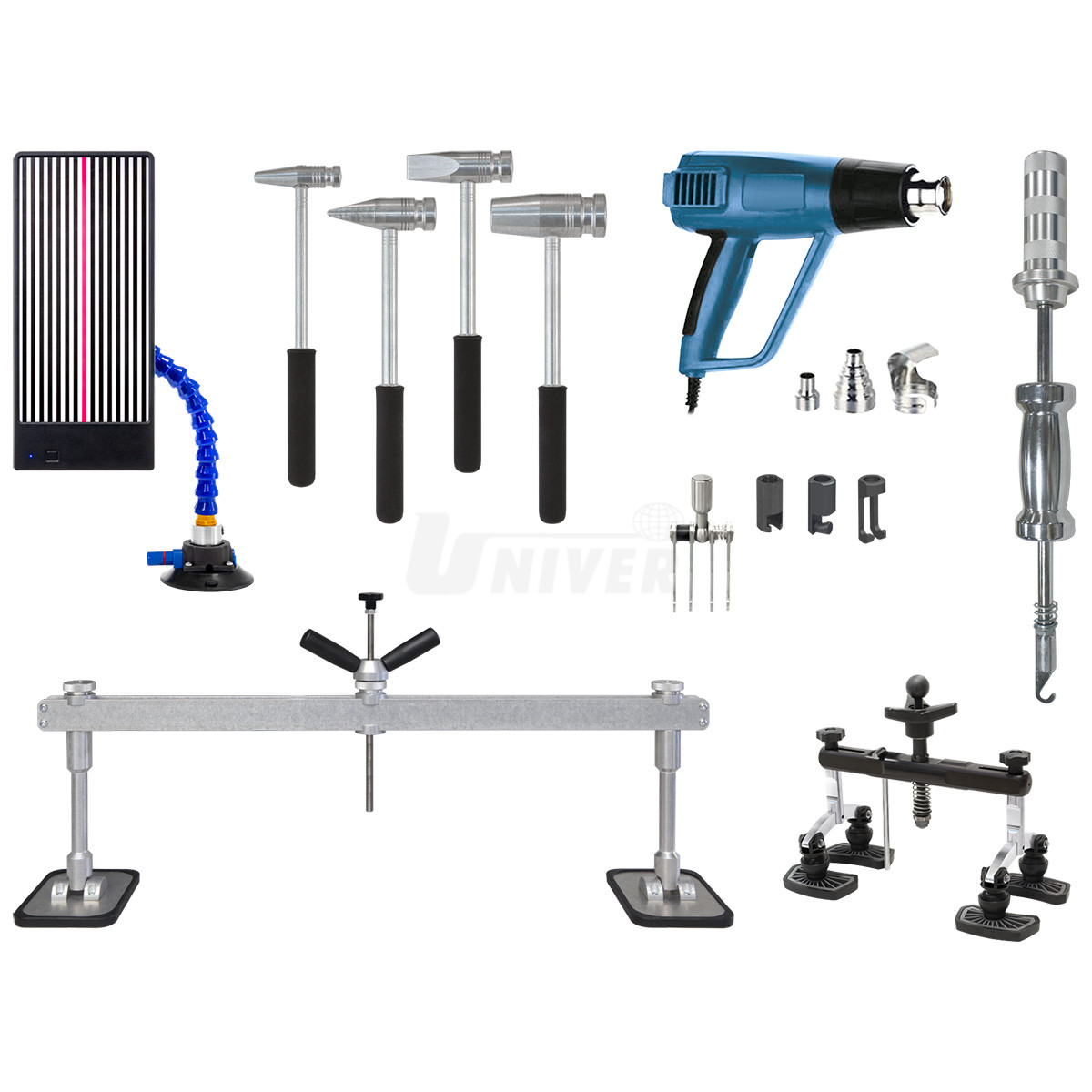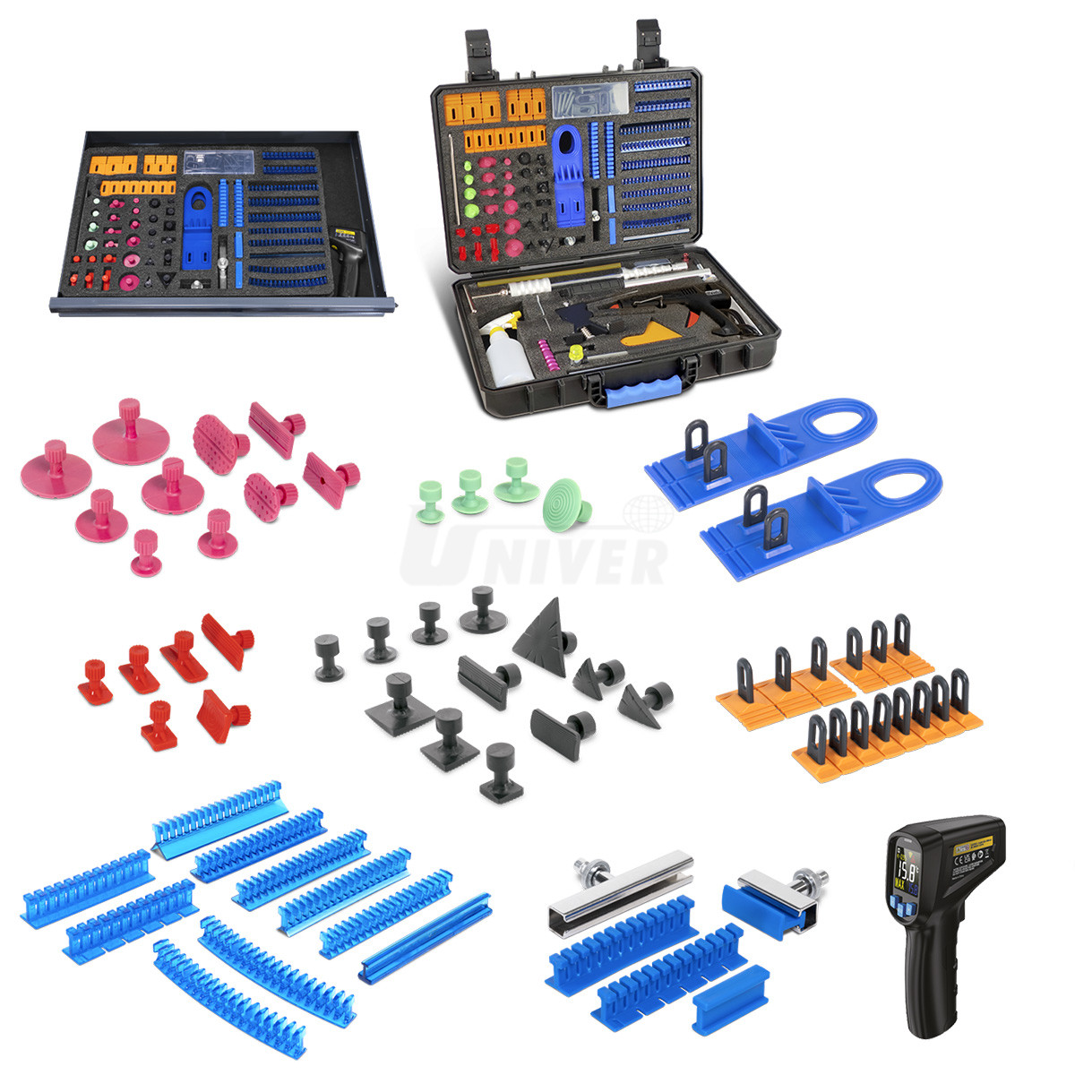- sada nářadí, přípravků a materiálu uložená ve vozíku obsahuje veškeré základní položky pro běžné a nejčastější opravy důlků a promáčklin technologií PDR, přičemž se jedná o opravy / rovnání plechu vytahováním