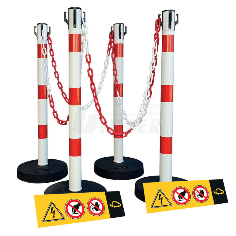snadno instalovatelné 4 výstražné sloupky s řetízky (vždy červeno-bílé), doplněné 2 výstražnými tabulkami