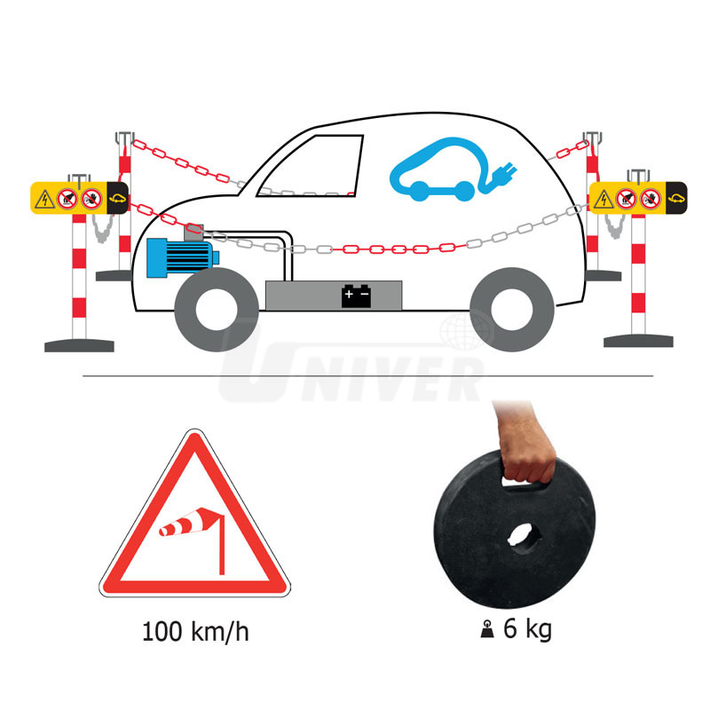 Sada 4 výstražných sloupků s červeno-bílými pruhy spojených s červeno-bílými řetízky (25 m) a 2 výstražné tabulky pro vymezení stání pro opravy elektromobilů.