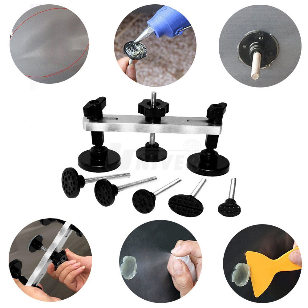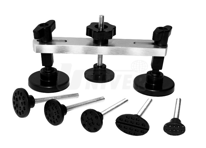 Můstek se 2 opěrkami a sadou plastových vytahovacích adaptérů s kovovými dříky pro odstraňování promáčklin karosérií.- opravy důlků a promáčklin na karosériích vozidel technologií PDR (Paintless Dent Repair) se provádějí pomocí speciálního nářadí a pomůcek za studena bez nutnosti provádět konvenční tmelení, broušení a lakování poškozeného místa, přičemž oprava vyžaduje méně času a je levnější