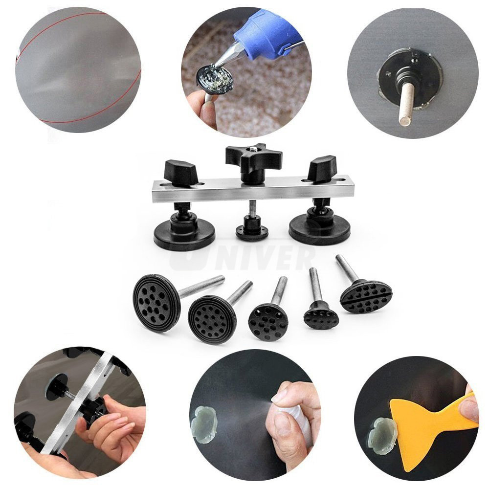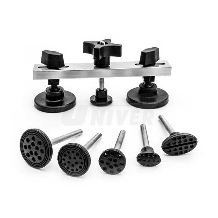 Můstek se 2 opěrkami a sadou plastových vytahovacích adaptérů s kovovými dříky pro odstraňování promáčklin karosérií.- opravy důlků a promáčklin na karosériích vozidel technologií PDR (Paintless Dent Repair) se provádějí pomocí speciálního nářadí a pomůcek za studena bez nutnosti provádět konvenční tmelení, broušení a lakování poškozeného místa, přičemž oprava vyžaduje méně času a je levnější