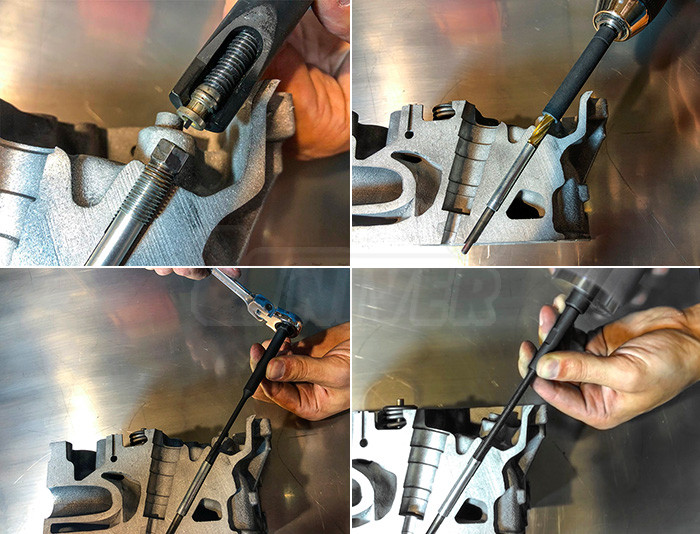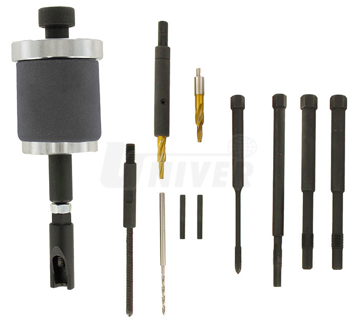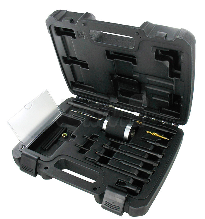 Sada přípravků pro demontáž i vadných (prasklých) žhavicích svíček dieselových motorů bez nebezpečí poškození hlavy válců.- sada umožňuje demontáž žhavicích svíček dieselových motorů, vytažení např. prasklých žhavicích svíček a renovaci / očištění závitu před montáží nové žhavicí svíčky