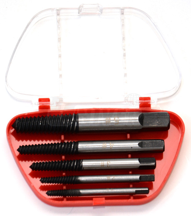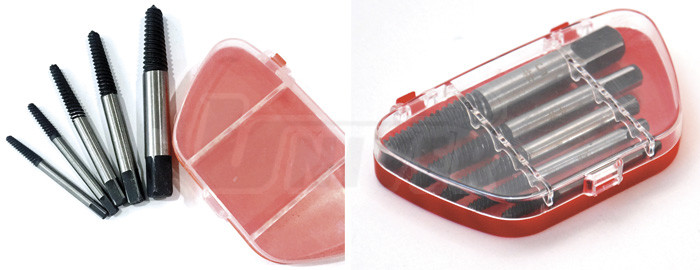 Sada přípravků/vytahováků pro vyšroubování zalomených (utržených nebo ukroucených) šroubů / čepů (5-dílná M3 až M18) v plastové kazetě.- vytahováky jsou podobné šroubům, ale mají kuželovou hlavici a závit opačného směru