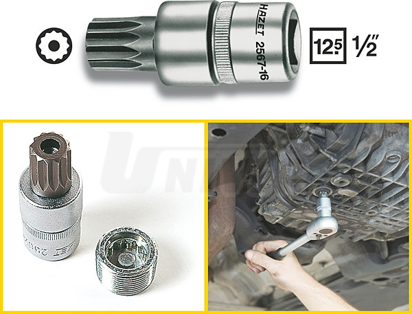 Speciální zástrčná hlavice 1/2" na vypouštěcí šrouby oleje z převodovek má tzv. "tisícihran" (Multi-SPLINE se středovým otvorem)i M16 dl. 60 mm. Je vyrobena z chrom-vanadia, pochromovaná. Používá se na šrouby, kterými se vypouští olej z převodovek vozů např. VW Passat B5, Golf 4, LT, T4, T5, Audi A2, A3, A4, A6, TT, Škoda Fabia, Octavia, Superb, Porsche Boxster, Ford Galaxy 1,9 TDI se šestistupňovou převodovkou.