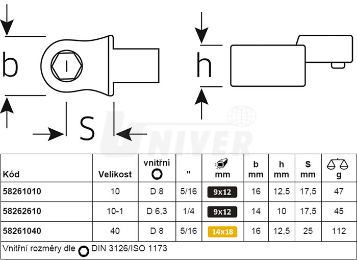 Držáky bitů k momentovým klíčům se zástrčným čtyřhranem podle DIN 3120. Vnitřní šestihran s prstencovou přítlačnou pružinou. Bity se nechají lehce zastrčit, bezpečně se zafixují a bez problémů je lze znovu vytáhnout, také šestihrany s širší drážkou (Form E, DIN 3126/ISO 1173).